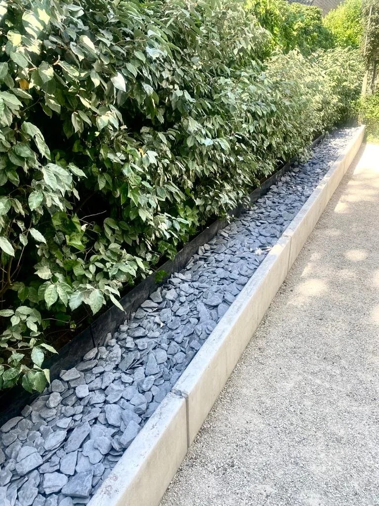 “Le schiste de Martelange” étant plat, 4 cm suffisent à couvrir votre parterre pour limiter la repousse des mauvaises herbes.